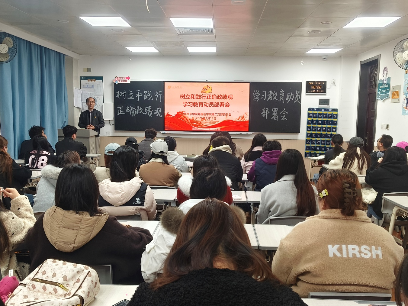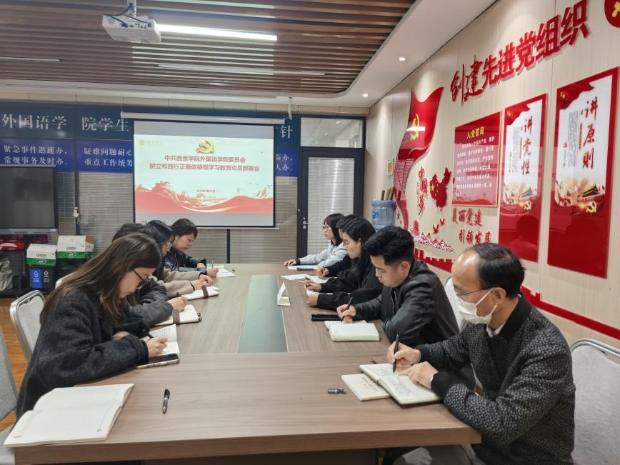 2026年3月13日,中共西京学院外国语学院委员会以“院党委统筹引领、各支部同步跟进”的工作模式,全面开展树立和践行正确政绩观学习教育动员部署工作。院党委率先召开全院动员部署会,各党支部于当日同步完成支部专题动员与工作安排,实现学习教育动员全院党员全覆盖,切实贯彻落实中央、省委及学校党委相关工作部署,为学院高质量发展锚定政治方向、凝聚奋进共识。